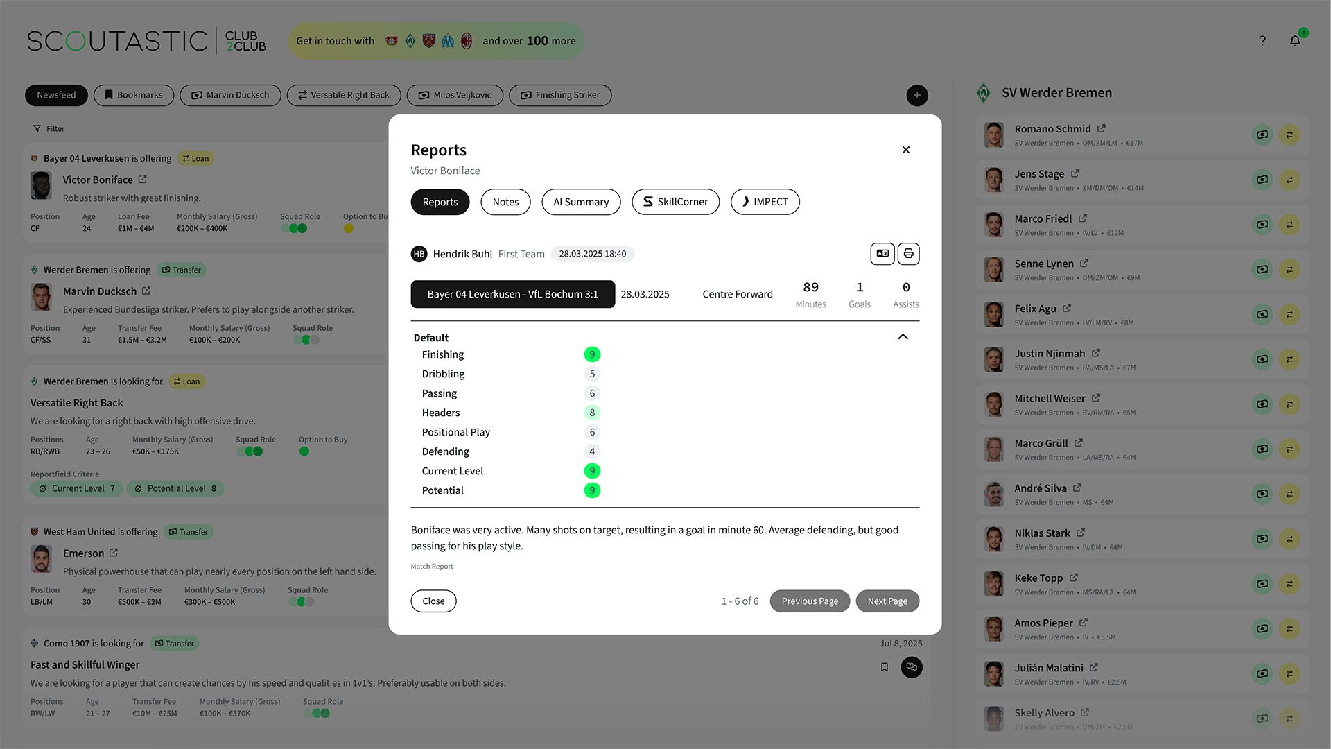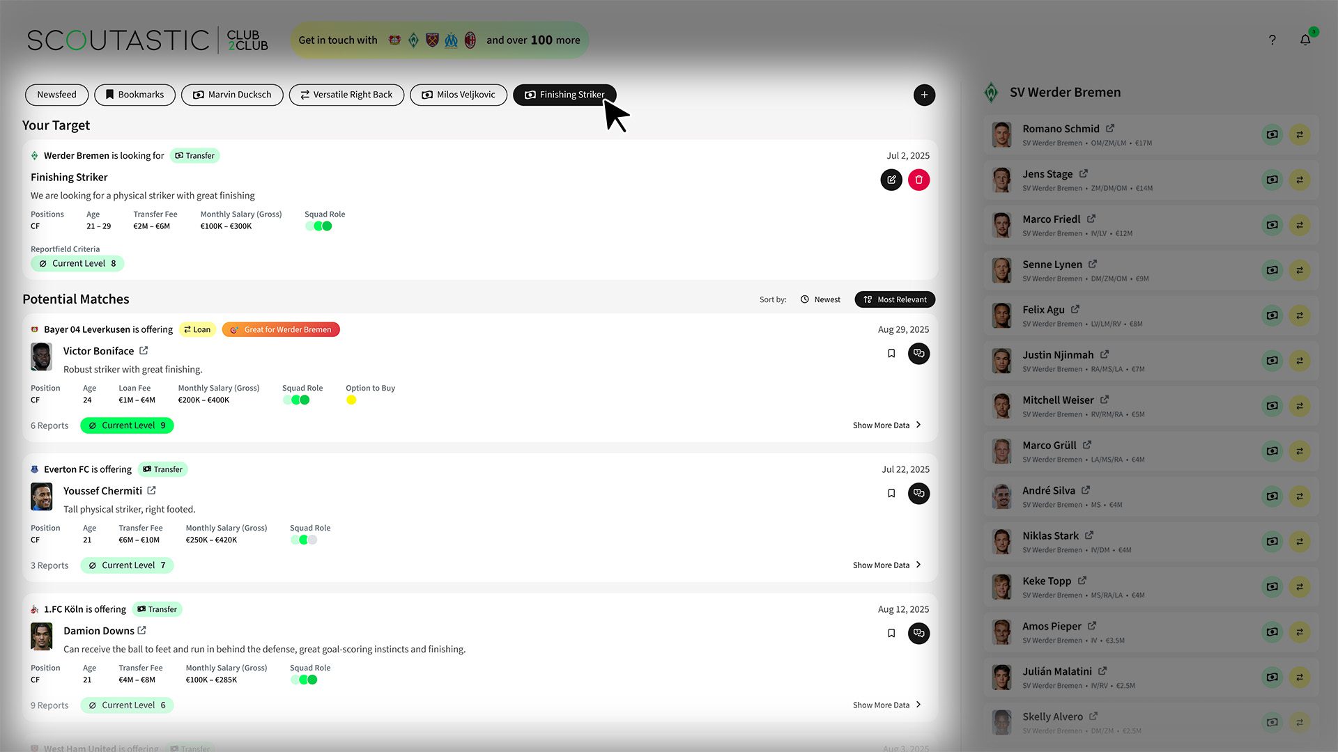 We will then show you potential matches for your pitch, so you can take the initiative and connect with clubs for possible transfer opportunities – no need to wait for them to reach out first.