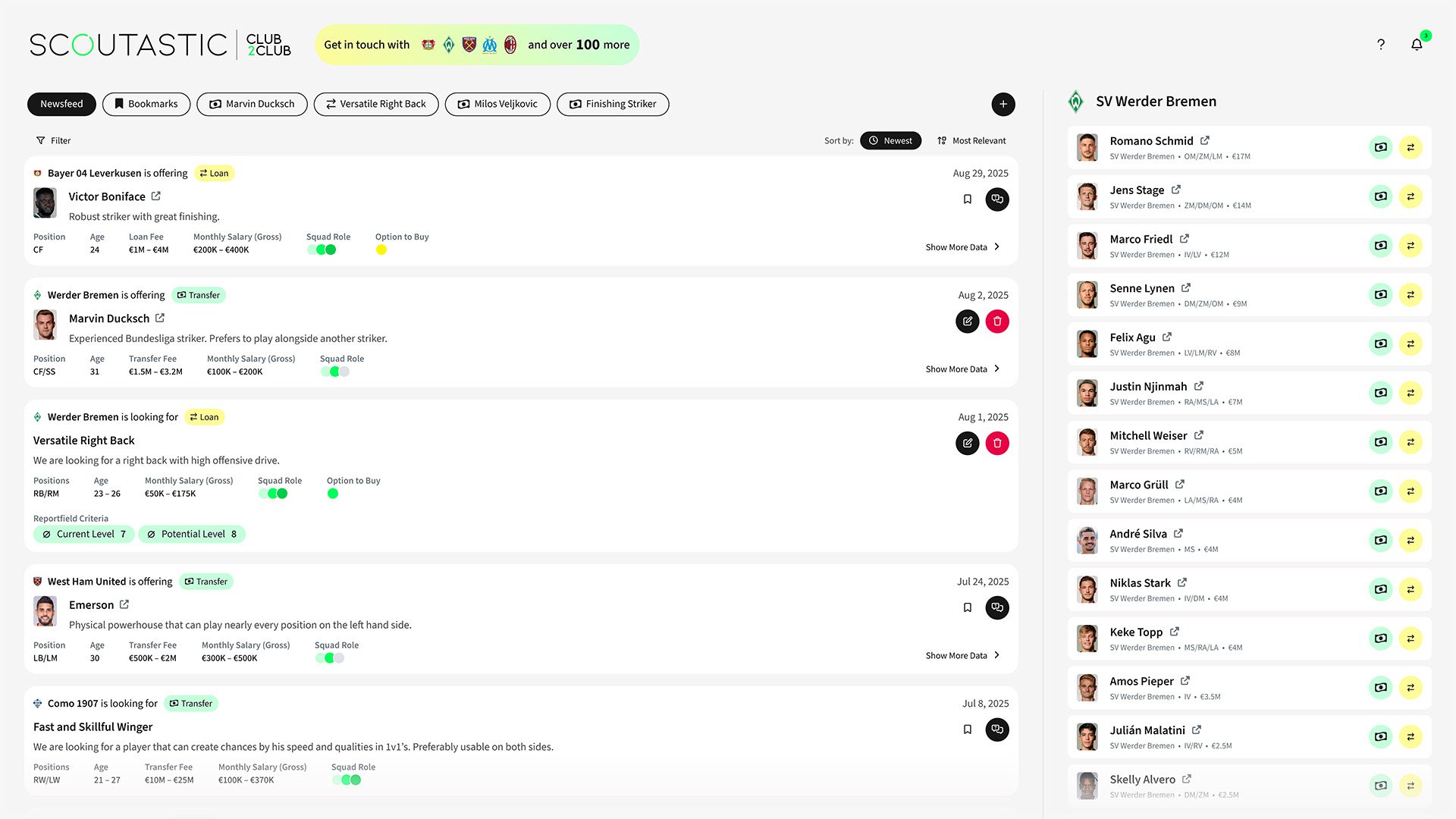 Pitch players from your squad on the platform – fully customisable to your needs. Share all key details instantly with other clubs using clear, easy-to-define parameters.